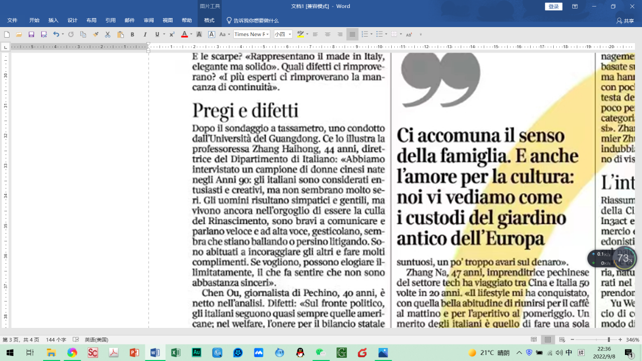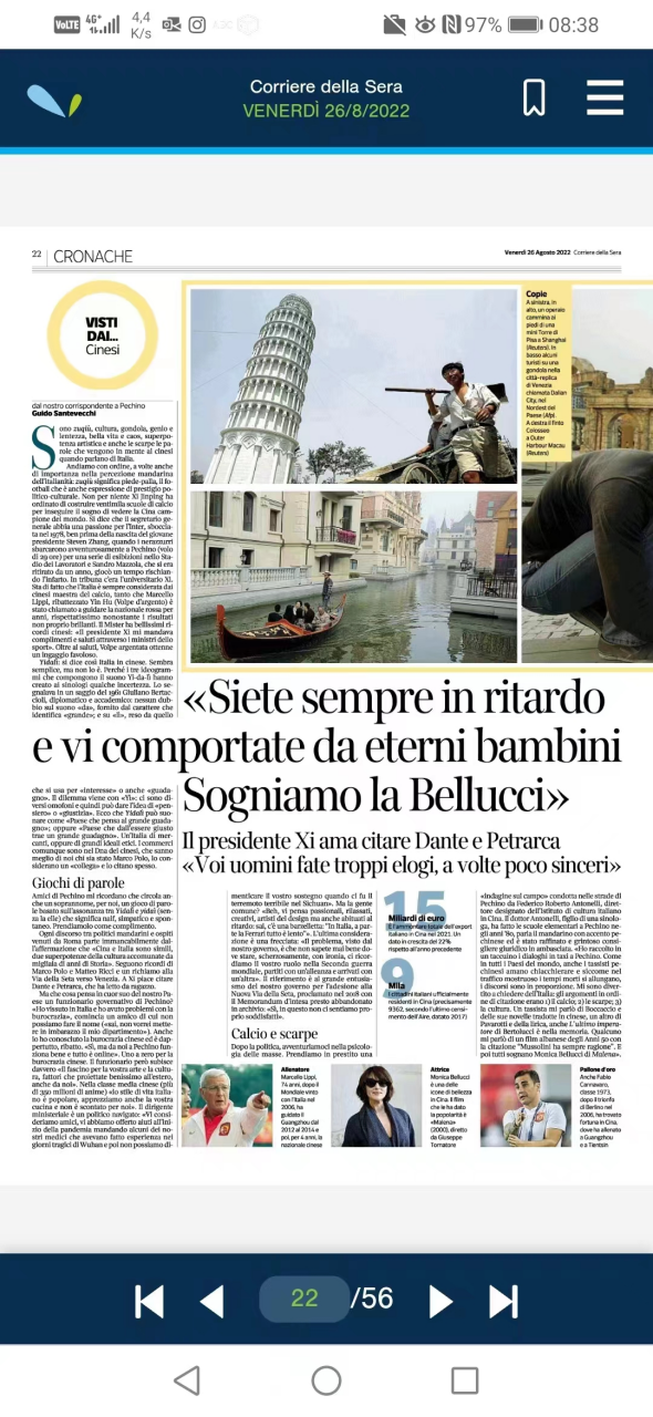 2022年8月26日,伟德国际betvlctor1946意大利语系张海虹教授接受意大利《晚邮报》采访。该报是意大利第一纸媒,也是其国内历史最悠久的报纸。采访中,张老师分享了她研究成果《形象、消费与身份认同:中国“90后”女性对意大利奢侈品消费》中我国九零后女性心目中的意大利人形象。