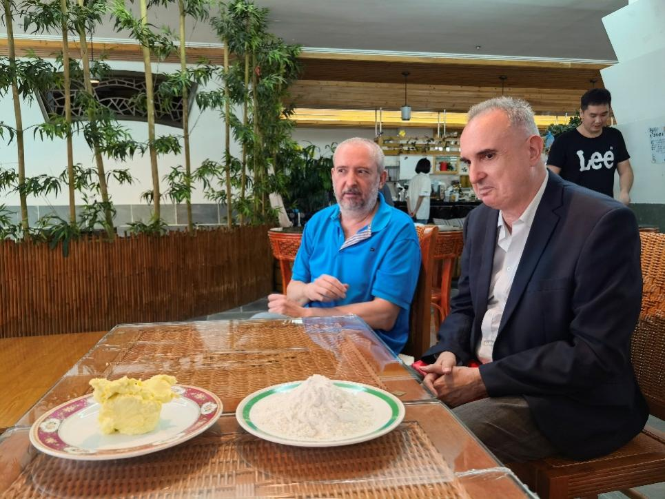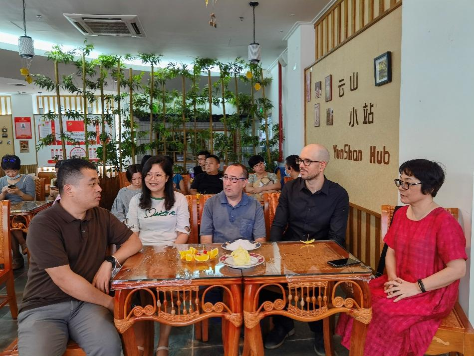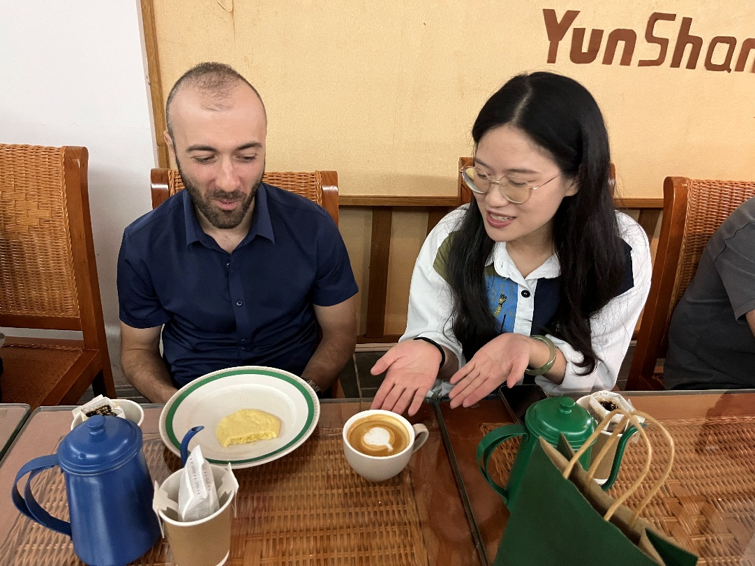 西班牙语外教正在与中教讨论咖啡文化