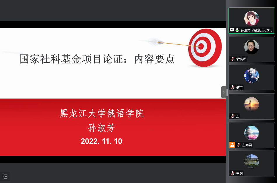 11月10日下午,伟德国际betvlctor1946召开了2023年度高层次项目申报指导会,会议邀请了第八届国务院学科评议组成员、黑龙江大学孙淑芳教授针对国家社科项目申报作了题为“国家社科基金项目论证:内容要点”的指导。 近40位教师通过腾讯会议参与此次指导会,会议由茅银辉副院长主持。