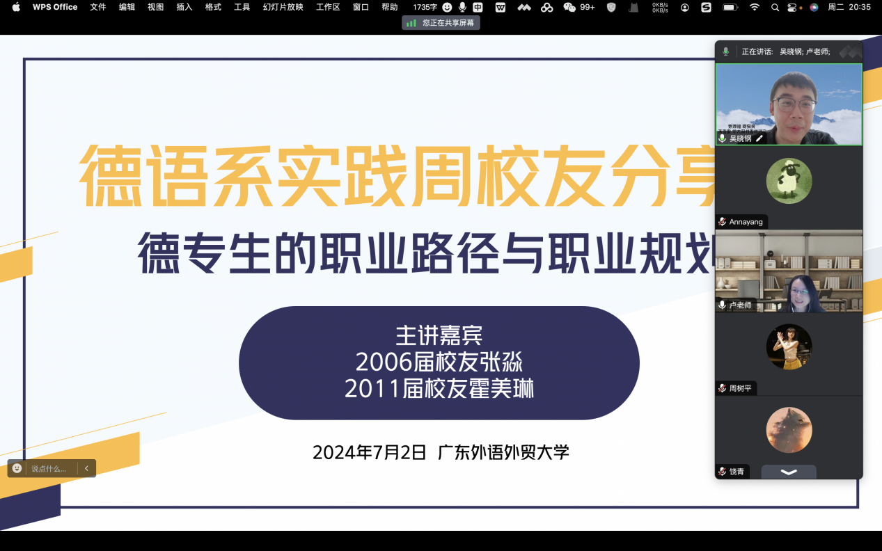 本网讯 2024年7月2日,伟德国际betvlctor1946德语系教学实践周重磅活动——德语优秀校友职业路径与规划经验分享会通过腾讯会议线上举行。本次分享会非常荣幸得邀请到了伟德国际betvlctor1946德语系2006届校友张淼先生与2011届优秀校友霍美琳女士,为在校德语专业学生带来了一场别开生面的“德语专业学生职业路径与职业规划”专题讲座。本次讲座吸引到德语系近50名同学参与,伟德国际betvlctor1946副院长卢铭君教授参加并致辞,德语系主任吴晓钢副教授主持。