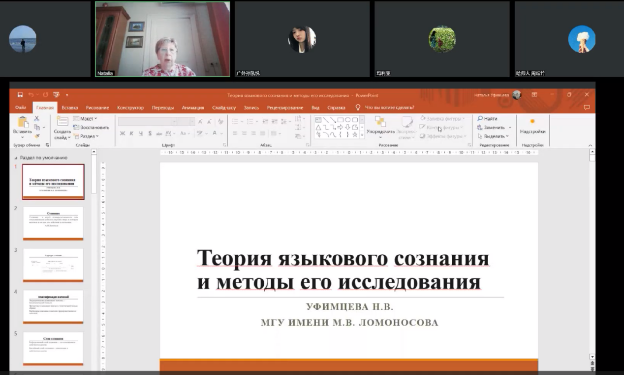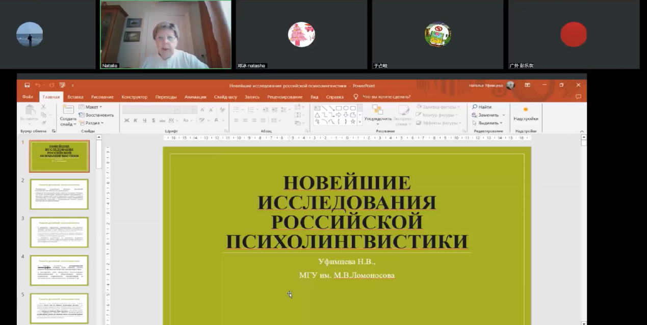 第二场讲座中,乌菲姆采娃教授首先讲述了研究历史最为悠久的莫斯科心理语言学派,并介绍了民族心理语言学的概念和相关的研究因素,指出语言对于产生民族世界观和意识共同性的必要性,以及“意识的内容总是由文化决定”,并以中国的汉语语言图景中的道德价值观为例加以解释。随后,乌菲姆采娃教授依次介绍了特维尔心理语言学派、彼尔姆心理语言学派和乌菲姆采娃心理语言学派,并展开描述了三个学派的研究内容。讲座最后,乌菲姆采娃教授深入讲解了圣彼得堡心理语言学派和沃罗涅日心理语言学派的相关研究,并列举了俄罗斯不同地区著名的心理语言学学者及其研究方向。本场讲座让大家对俄罗斯心理语言学各大学派有了进一步的了解。