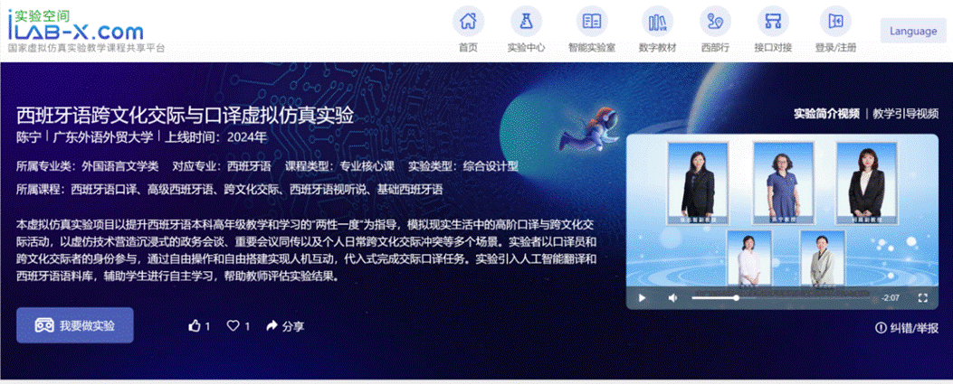 该虚拟仿真实验课程共4学时,面向所有西班牙语学习者开放。以现实的跨文化经历为蓝本,以口译译员为角色扮演,以交际和口译任务为导向,不仅注重全面提高实验者的西班牙语知识能力,训练听懂结构复杂或逻辑性不强的长篇演讲、在社会和职业交往中灵活准确表达并能有机地接续谈话者的话题;更强调培养双向跨文化能力,也就是意识到文化处于不断的互化和影响中,培养以平等、自信和包容的态度进行交际,在接受对象国文化的同时,有意识地建构现代中国的自我文化身份并影响对方。同时还设计了语言文化冲突环境,通过虚拟场景训练语用能力,也就是学习如何以妥当的方式处理口译中可能引起误解和冲突的表达,处理刻板印象、应对人际不礼貌,保证交际的友好顺畅。课程还特别训练口译员的职业能力,以熟练的交替传译能力、初步的同声传译技能和心理素质为目标,培养短时记忆技巧和笔录技巧,以及将源语言转换成逻辑清晰、意思完整并符合表述习惯的目的语的素质。