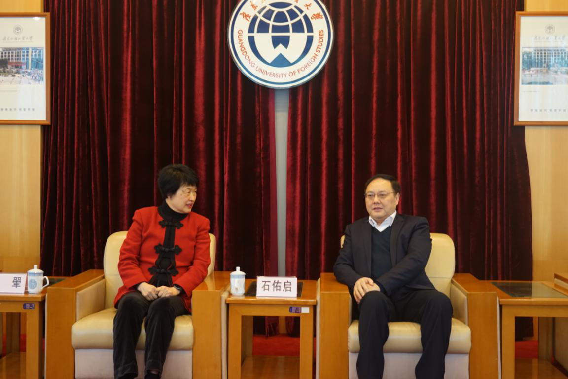 (2019年,隋翚作客广外探讨国际化办学建设,广外时任校长,现任校党委书记、校长石佑启会见隋翚)