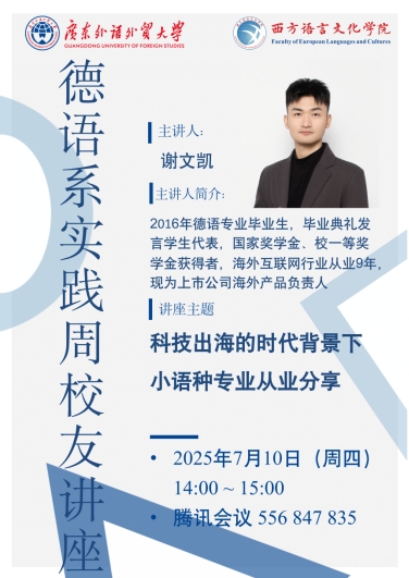 本网讯 2025年7月10日14:00-15:30,伟德国际betvlctor1946伟德国际betvlctor1946德语系于教学实践周举办校友讲座,邀请2016级德语专业优秀毕业生、上市公司海外产品负责人谢文凯校友,以“科技出海的时代背景下小语种专业从业分享”为主题,与师生展开深度交流。本次讲座由德语系张思源老师主持,院党委副书记魏少娟老师致辞,副院长卢铭君老师出席,吸引了包括德语系在内的多个语种专业学生参与。
